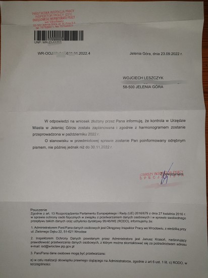 W nawiązaniu do mojego tekstu z 26 stycznia br., pod tytułem: Publiczno-prywatny prezydent miasta, informuję, iż Państwowa Inspekcja Pracy przeprowadzi kontrolę w Urzędzie Miasta Jelenia Góra. Inspektorzy skontrolują to, czy pracownicy UM byli w godzinach pracy zmuszani do prowadzenia prywatnego (jak wynika z pism UM) profilu Prezydenta Miasta Jeleniej Góry Jerzego Łużniaka. W skanach pism jakie zamieściłem w styczniu, pada stwierdzenie, iż profil na Facebooku jest prywatnym Pana Jerzego Łużniaka, w związku z czym użytkownicy/komentatorzy mogą być dowolnie blokowani.