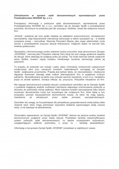 "Otrzymałem zapewnienie, że Zarząd Spółki "WODNIK" dokona raz jeszcze analizy skutków ekonomicznych podjętych przez siebie decyzji. Przedstawi bardziej zdywersyfikowany system podwyżki opłat abonamentowych, co będzie rozwiązaniem racjonalnym, uwzględniającym wielkość podmiotów, a przez co - bardziej sprawiedliwym.
